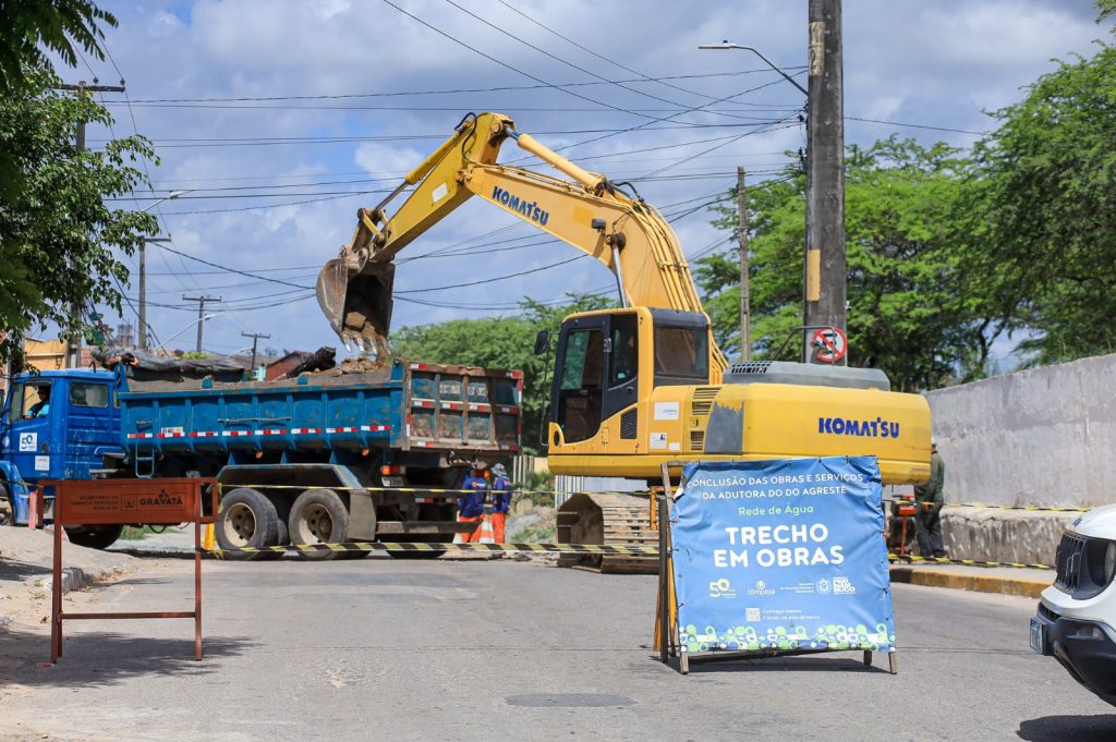 Trecho da Rua Quatro de Outubro passa por bloqueio temporário do trânsito pelas obras de ampliação da Adutora do Agreste