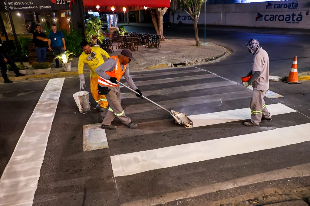 A Prefeitura de Gravatá, por meio do Departamento Municipal de Trânsito, iniciou na noite desta terça-feira (3) a pintura de faixas de pedestres em diversos pontos da cidade. A ação integra o trabalho contínuo de manutenção e revitalização da sinalização viária, com foco na segurança de pedestres e motoristas.